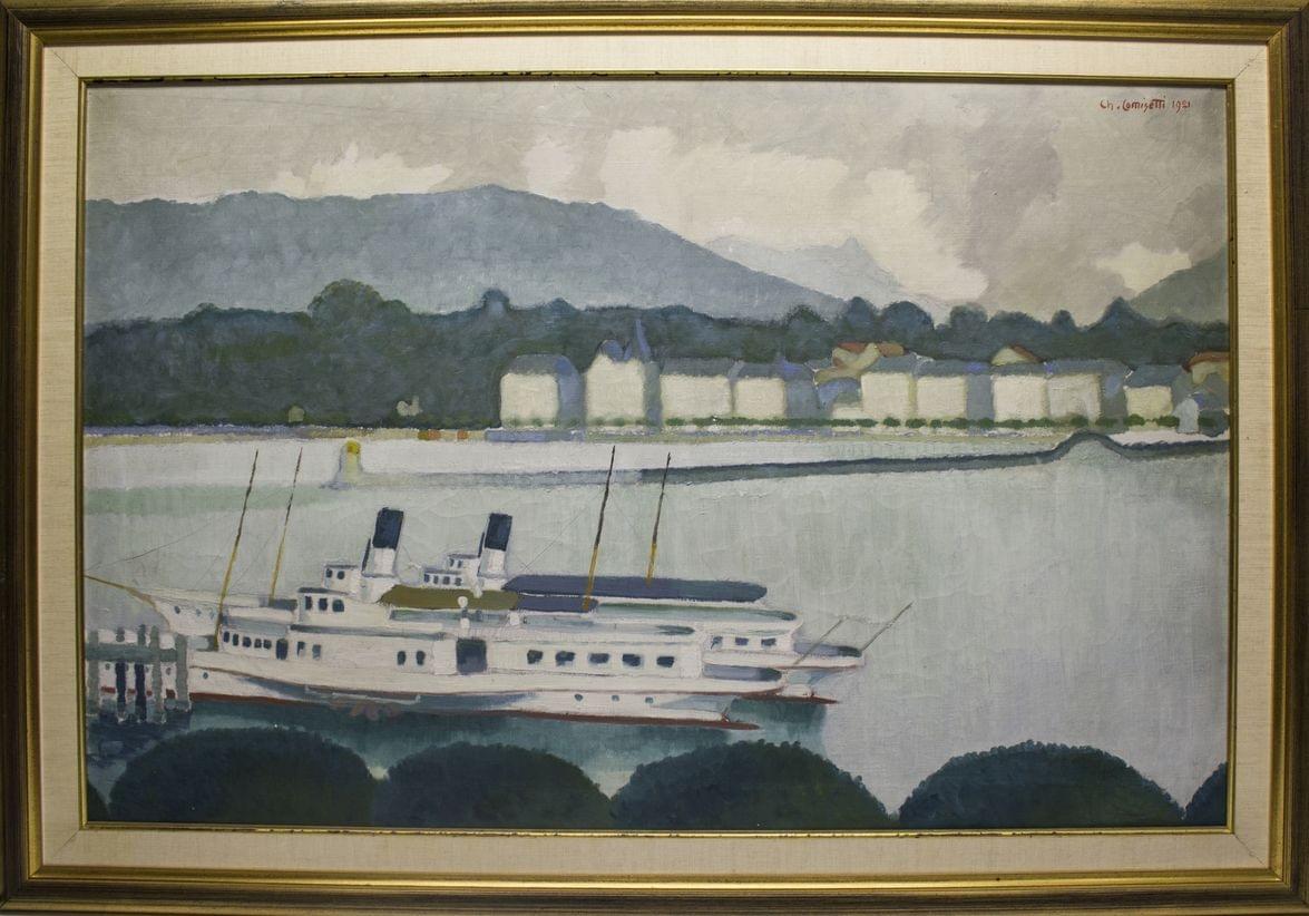 Bateau à vapeur sur le lac Léman, huile sur toile signée et datée 1921, 64x98 cm