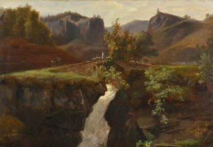 Bergère sur un pont, vallée de Lauterbrunnen, huile sur panneau...