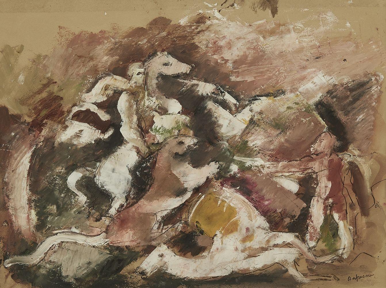 Chevaux se cabrant, encre et gouache sur carton, signée, 29x38 cm