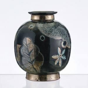 Vase à anses à décor d'un bouquet, céramique émaillée violet, bl...