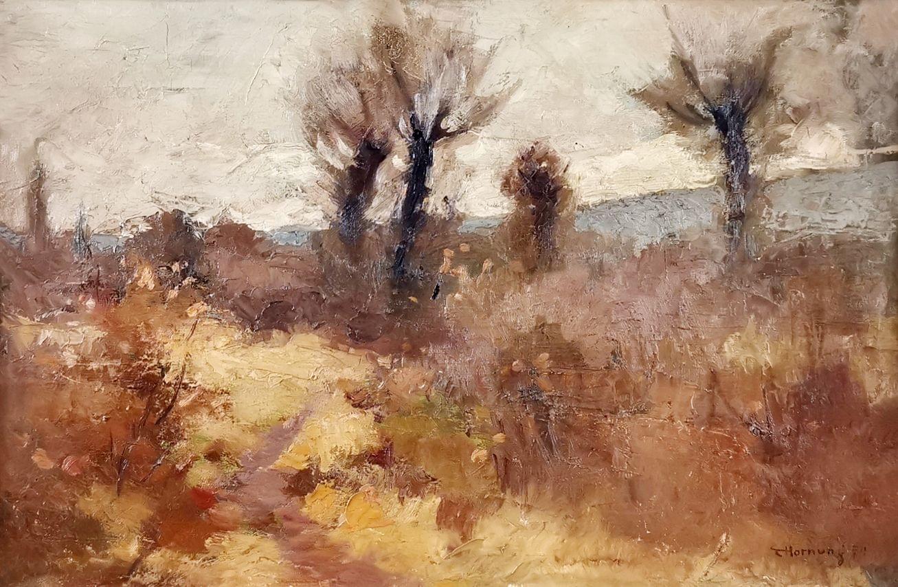 Broussailles à Confignon, huile sur toile, signée et datée 27, 27x41 cm