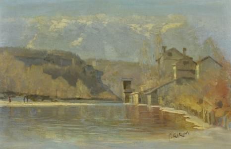 Fleuve en hiver, huile sur carton signée, 18x29 cm