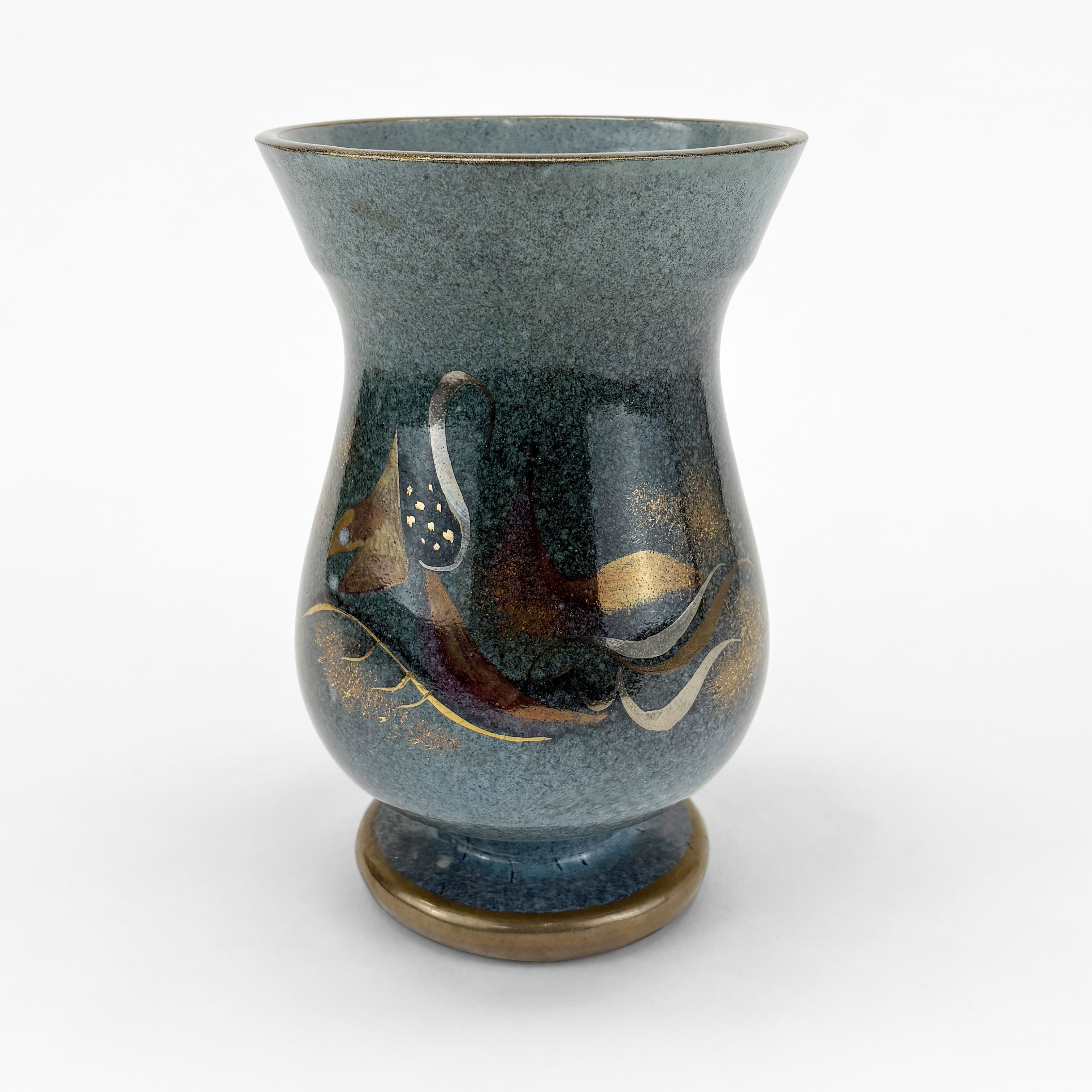 Vase en terre cuite émailllée bleue réhaussée d'or, H 23 cm