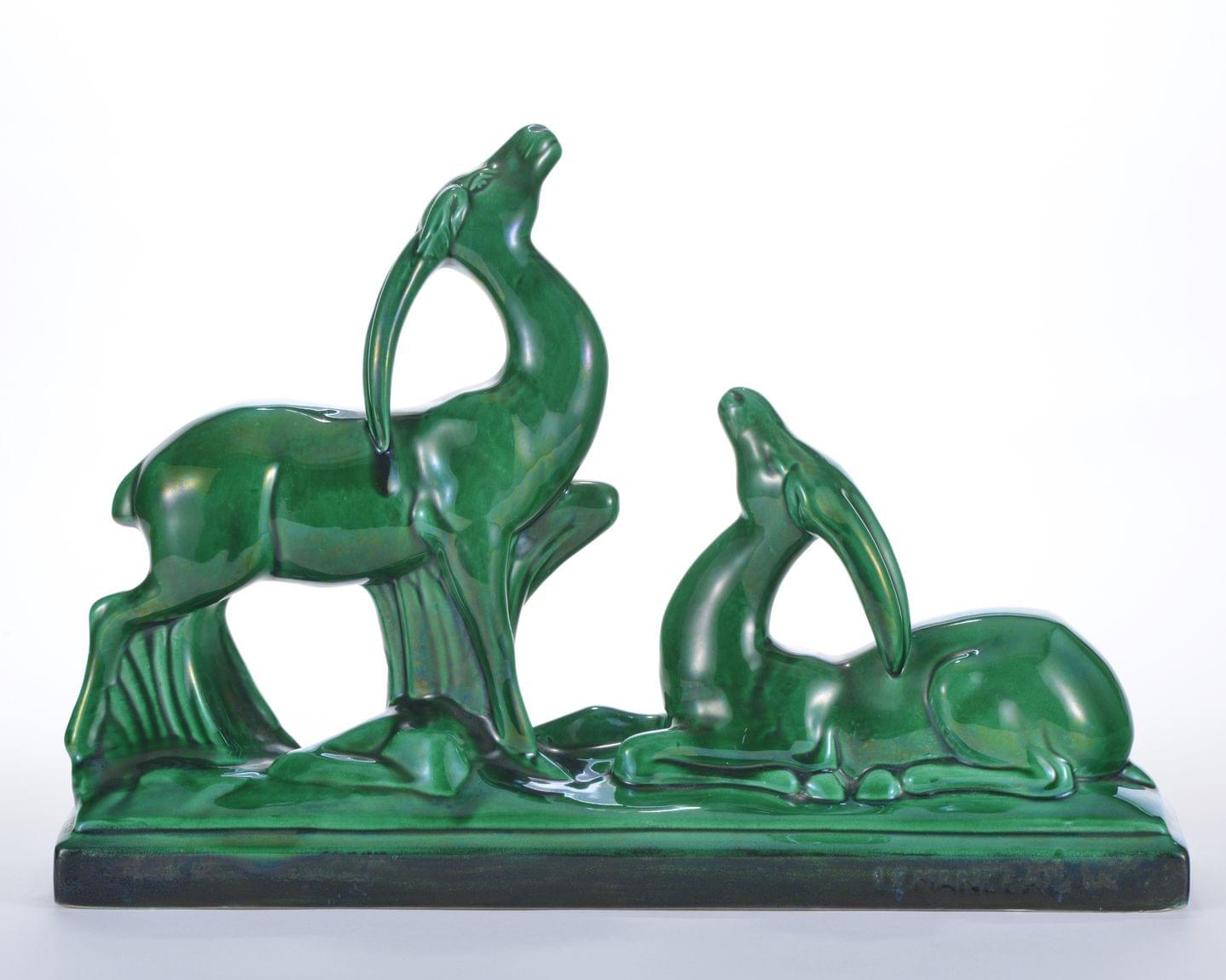 Couple d'antilopes, céramique craquelée verte, atelier Sainte Radegonde, 33x48 cm. In Les craquelés, animaux en céramique 1920/1940, ed. Massin, ill. P. 92 et 93