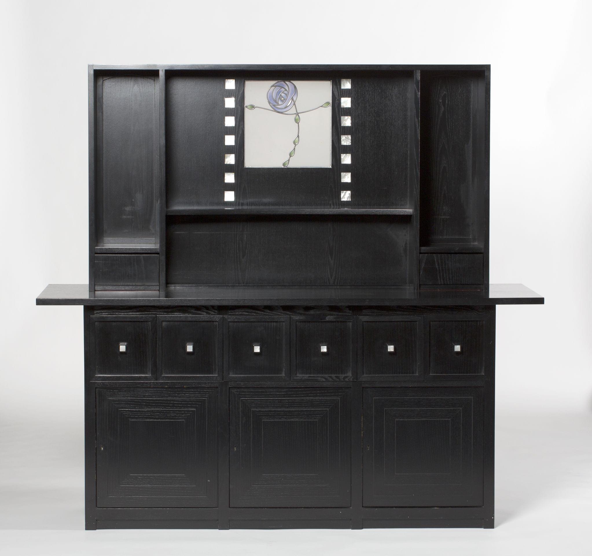Buffet 327 DS, frêne teinté noir, verre, 152x163x57 cm