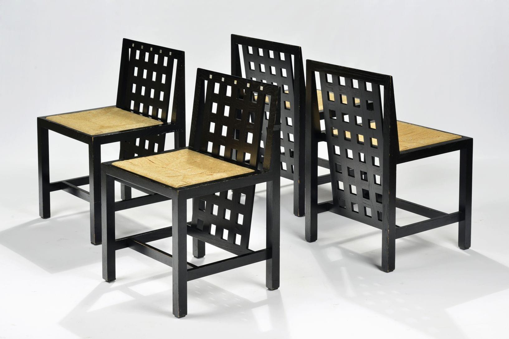Quatre chaises Hill House, édition Cassina, bois laqué noir et assise paillée