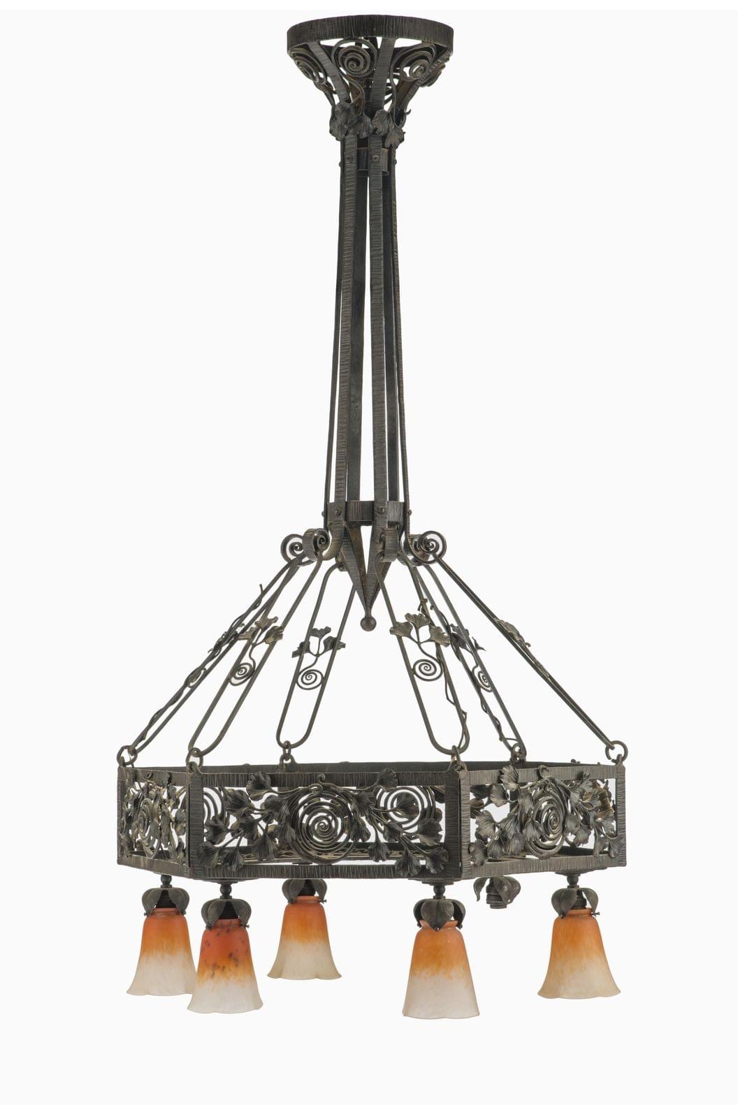 Grand lustre Art déco, six lumières, fer forgé, verre teinté orange, 146x68cm