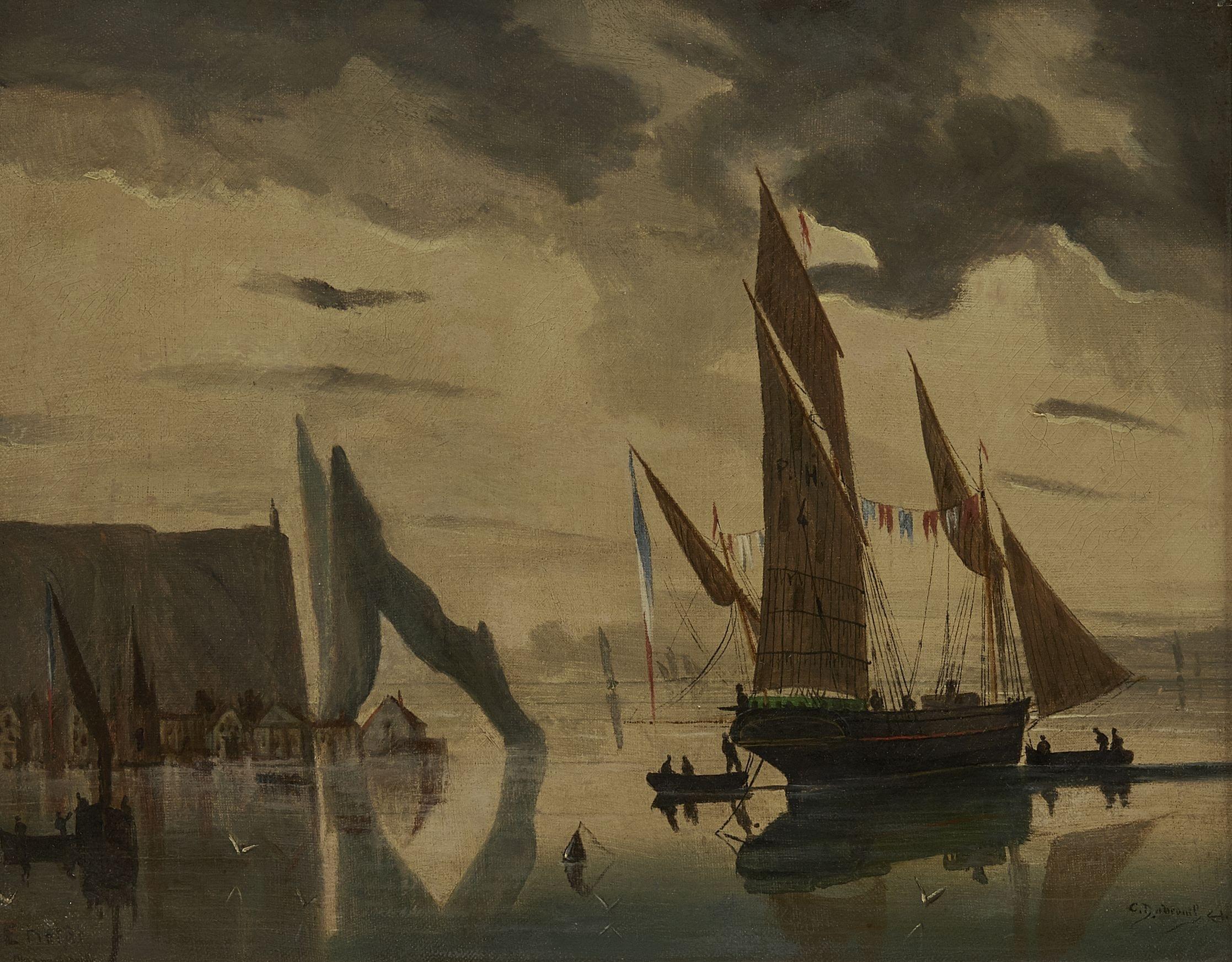 Bateaux, huile sur toile, signée, datée 1872, 60x100 cm