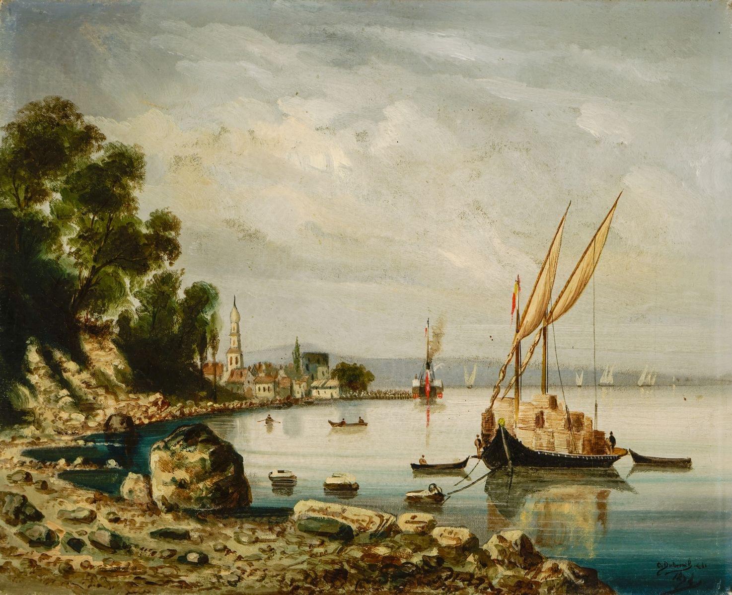 Paysage avec étang, bois gravé, signé, 15x21 cm