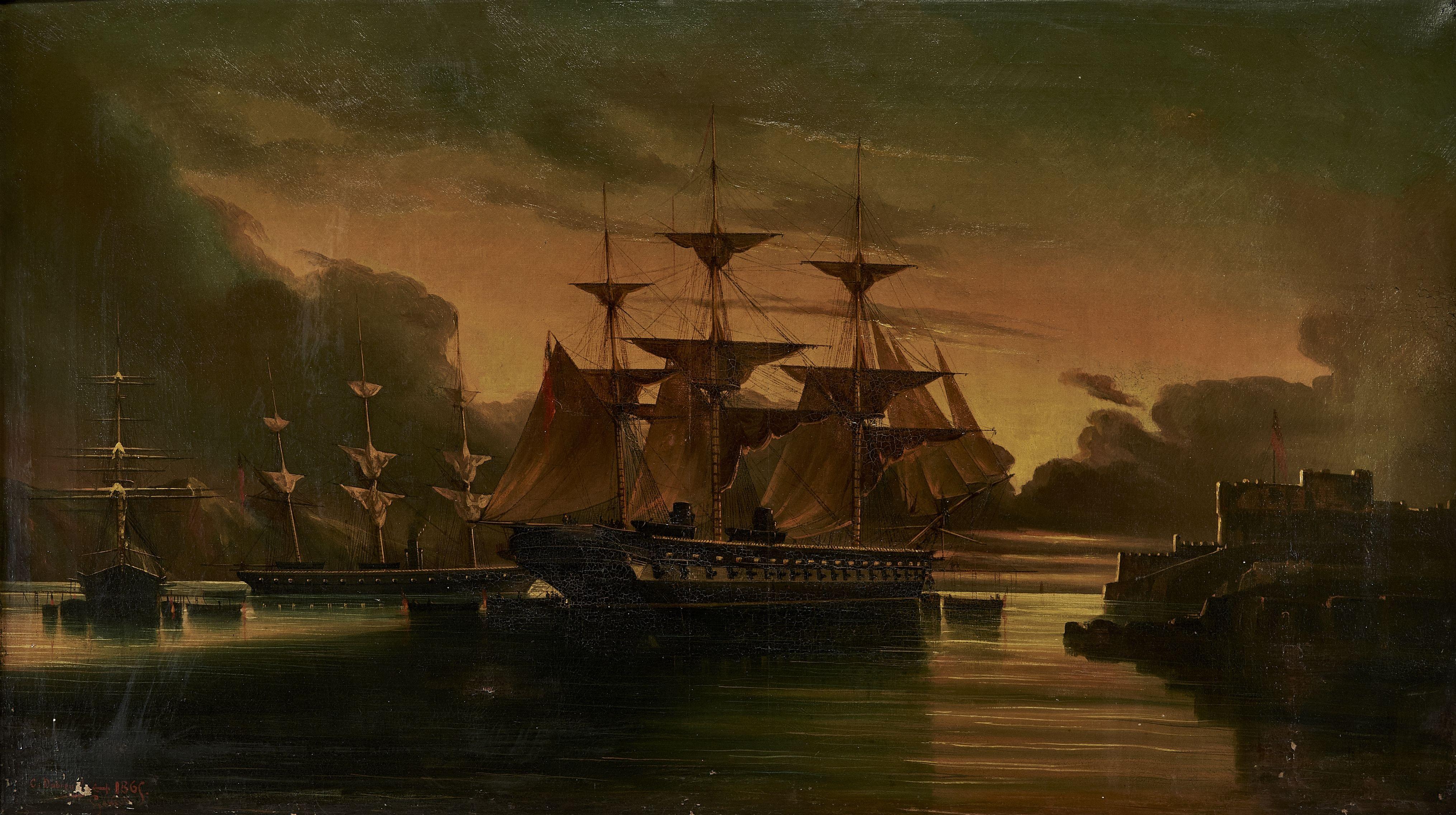 Bateaux, huile sur toile, signée, datée 1872, 60x100 cm