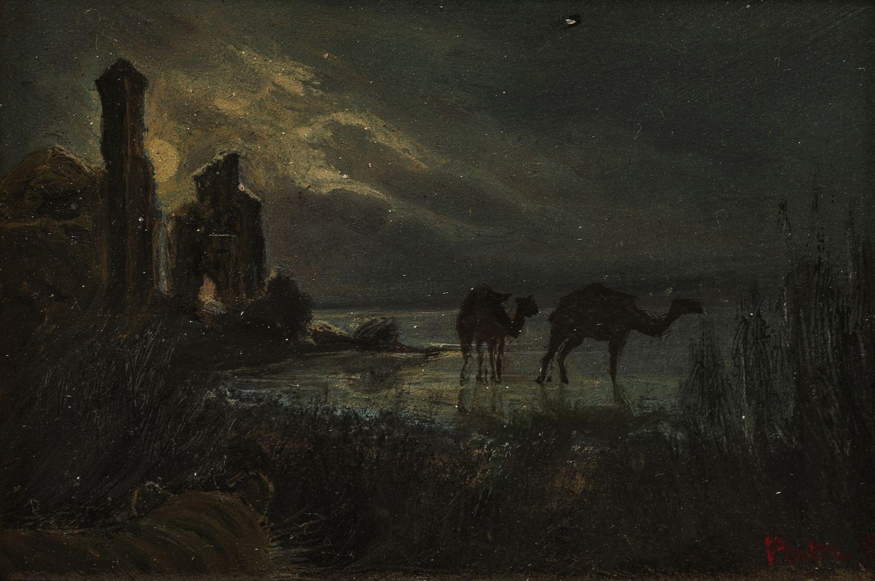 Tigre et dromadaires, huile sur panneau, signée, 9x12,5cm