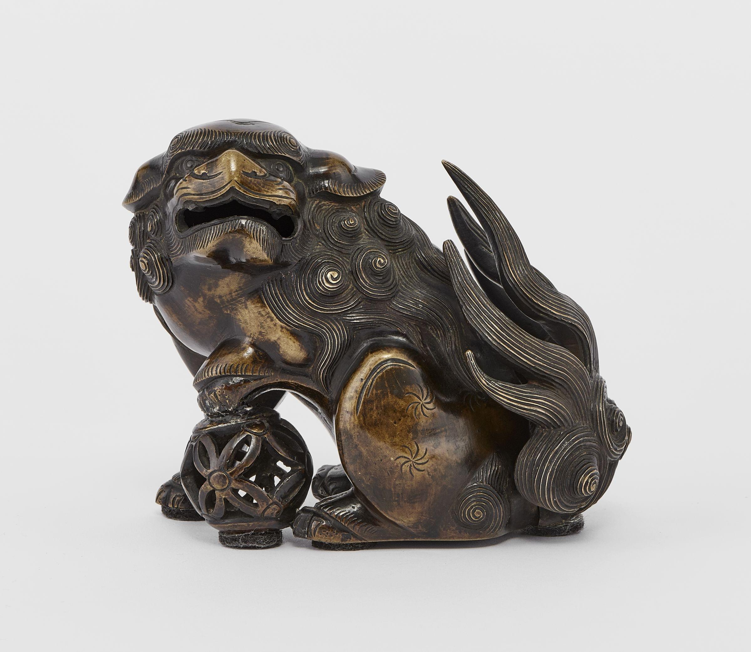 Porcelaine émaillée bleu blanc à décor de chiens de Fô, H 21 cm....