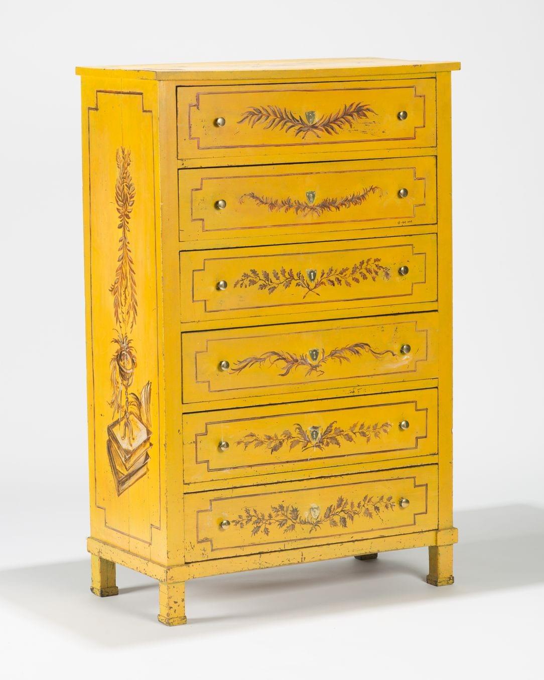 Bois peint à décor de rinceaux et trophées en camaïeu ocre sur fond jaune, six tiroirs, 152x98x49 cm