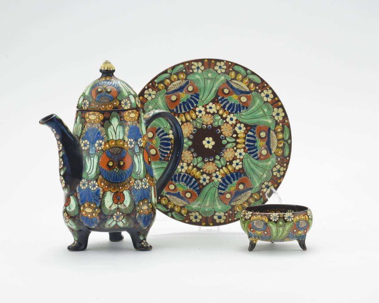 On y joint une coupe tripode et une assiette en terre vernissée du meme modèle, signature d'un cachet en relief "Thoune Johann Wanzenried", D 8 cm.