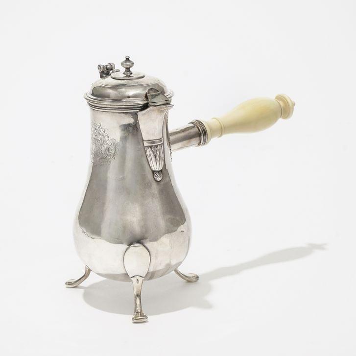 Porcelaine et émaux polychromes à décor de vases, anse gainée d'...
