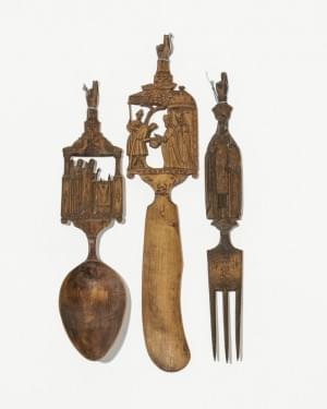 151. Couteau, fourchette et cuillère à manche sculptés de scènes reli...