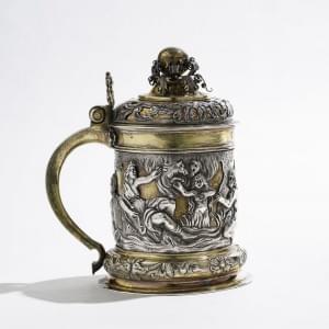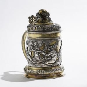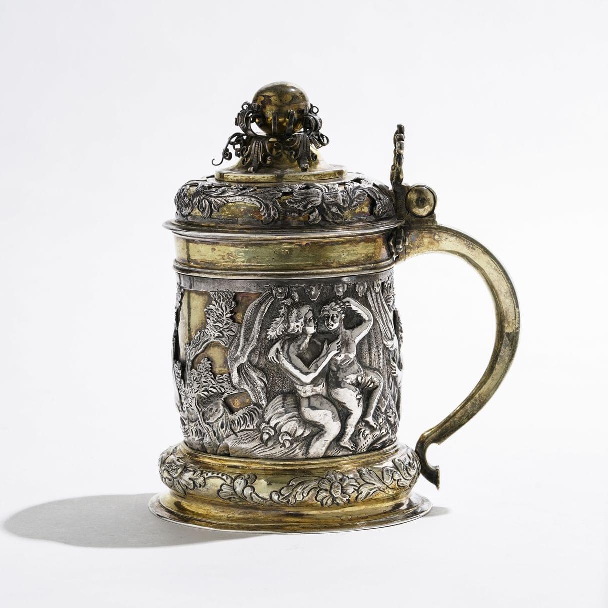 Frises de rinceaux et fleurs appliquées et repoussées, poussoir en forme de sirène et frétel sphérique flanqué de volutes, datée 1691, Banská Bystrica, actuelle Slovaquie, autrefois dans une partie du Royaume de Hongrie sous influence germanique et connue, sous le nom de Neusohl, pour ses mines d'or, d'argent et de cuivre, exploitées notamment par la célèbre famille Fugger d'Augsburg. Les deux scènes mythologiques sont tirées des planches représentant les Métamorphoses d'Ovide gravées par Crispin de Passe I (ca 1564-1637), d'après ses compatriotes Hendrick Goltzius (1558-1617) et Maarten de Vos (1532-1603), publiées en 1602 aux Pays-Bas; argent et vermeil, H 17 cm, 690g