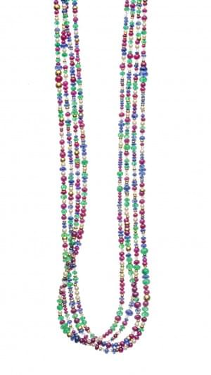 230. Sautoir ouvrant de perles de rubis, saphirs, émeraudes, perles,...