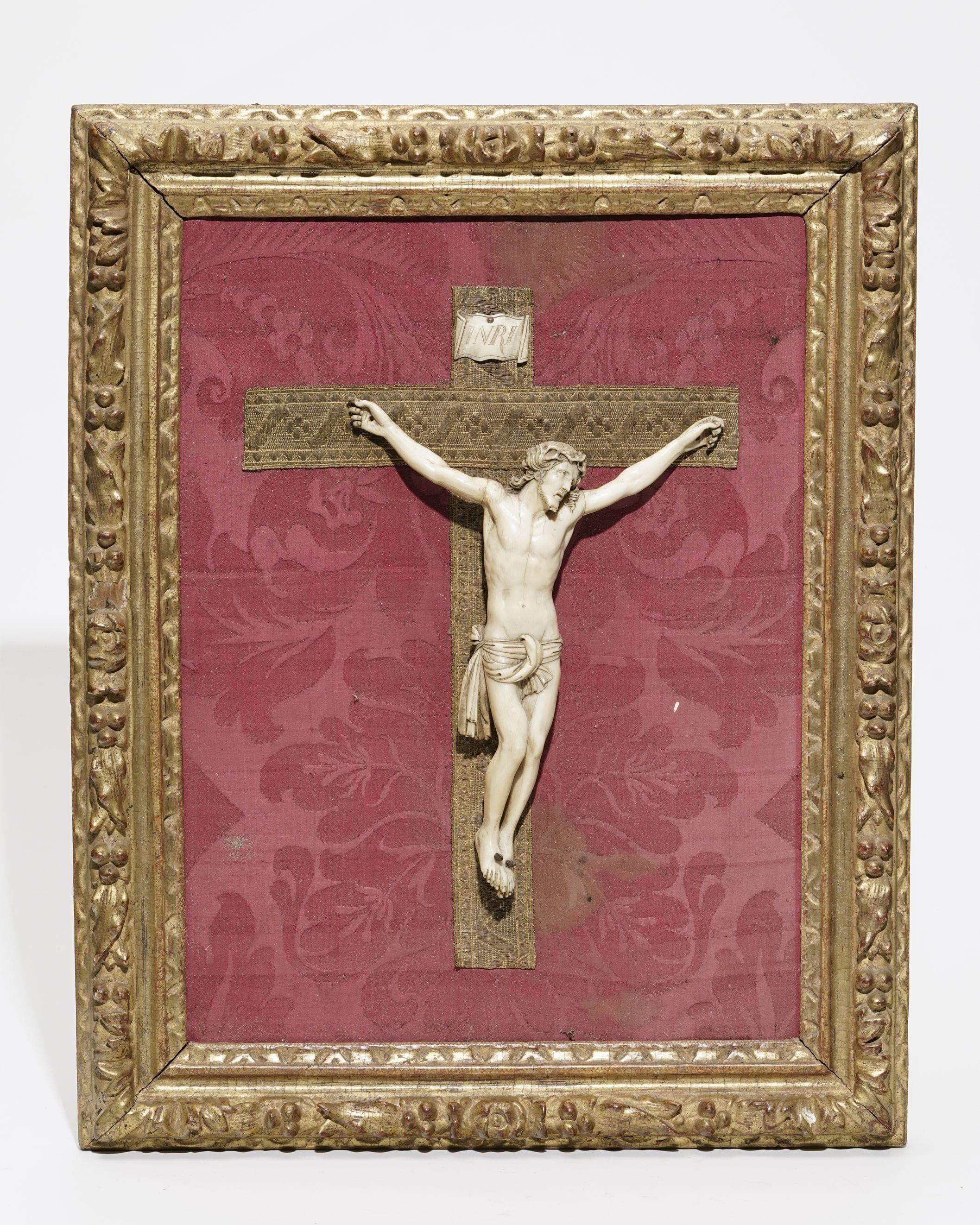 Ivoire sculpté, cadre en bois doré et sculpté XVIIIe s, H 26 cm