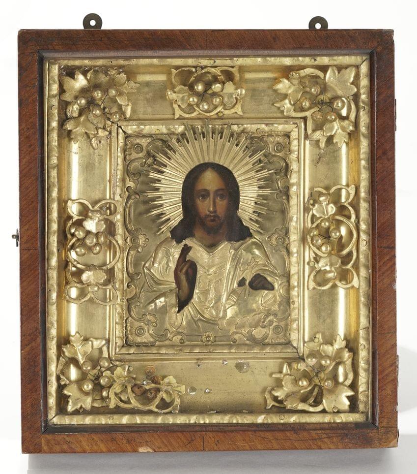 Icône russe, tempera sur panneau, avec oklade et boîte, 30x26 cm
