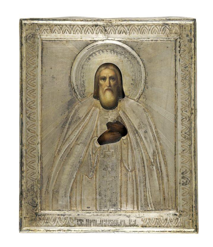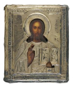 Icône russe, tempera sur panneau, oklade en vermeil et en argent...