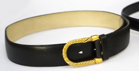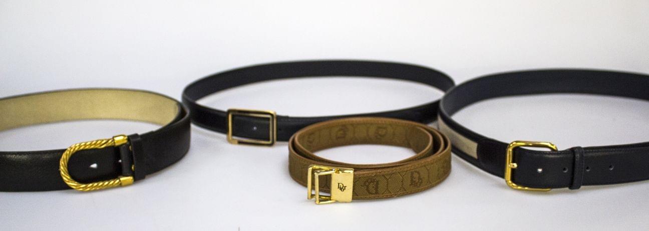 Lot de 4 ceintures, une en toile siglée camel T90, une en toile et cuir bleu et crème T95, l'une en cuir noir T75 et une autre en T90