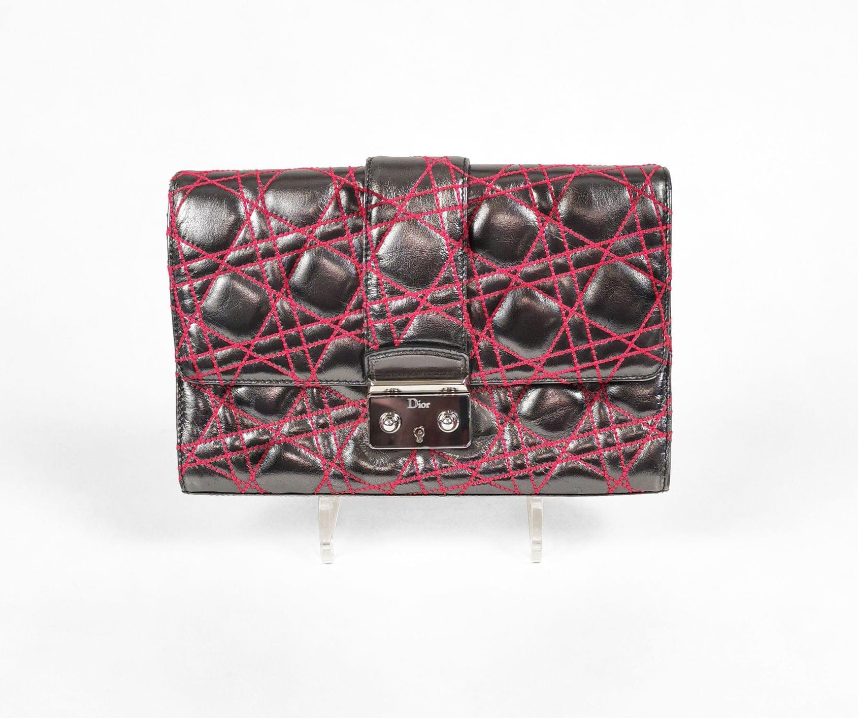Cuir en cannage métallique argenté, surpiqûre fushia, fermoir à pression, intérieur en toile camouflage rose et gris, env. 15x22,5x4 cm