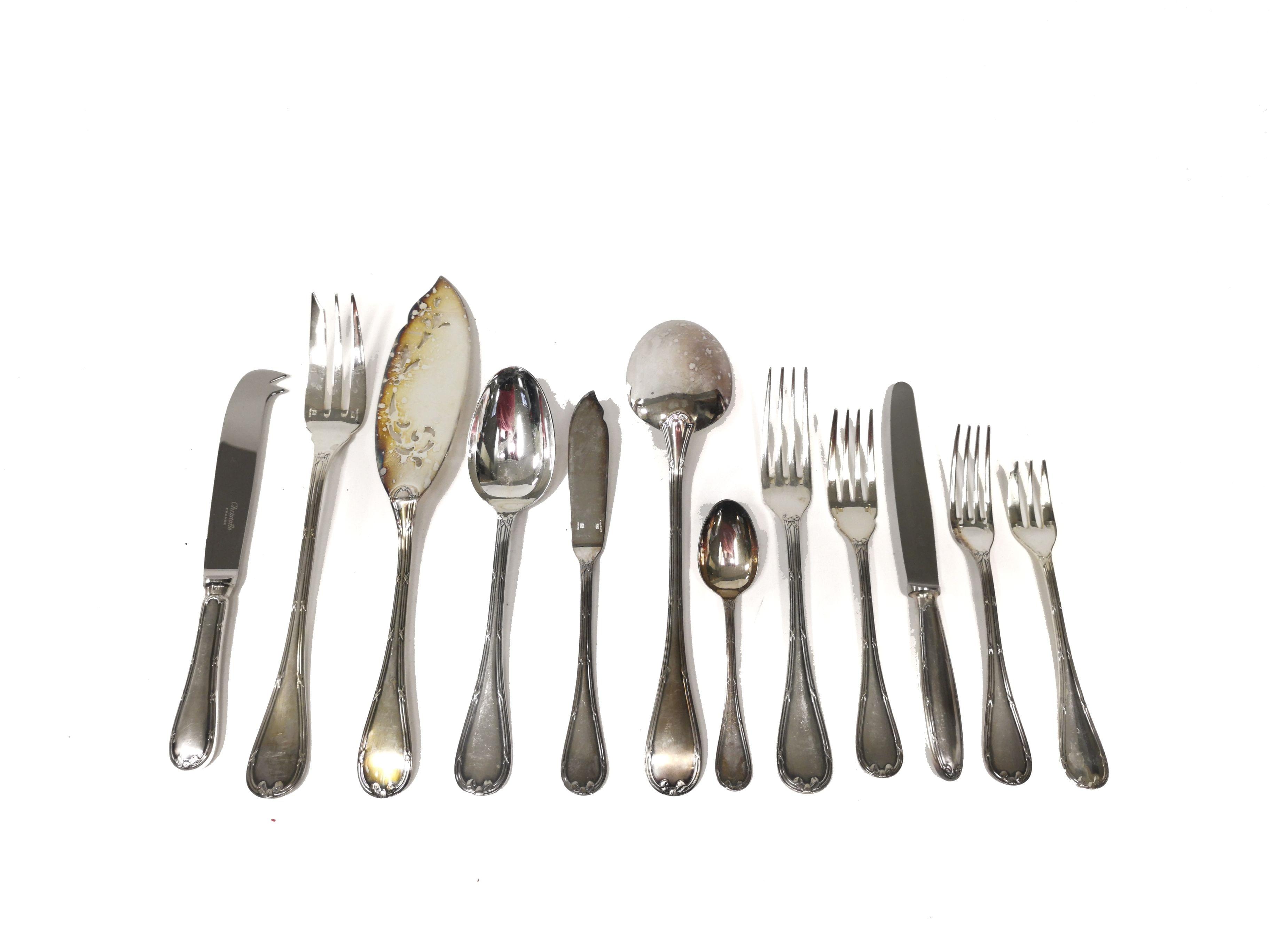 Métal argenté, comprenant: 12 fourchettes et 12 couteaux à dîner, 12 fourchettes et 12 couteaux à entremets, 12 cuillères à café, 10 fourchettes à pâtisserie, 8 fourchettes et 8 couteaux à poisson, 5 pièces de service (91 p)