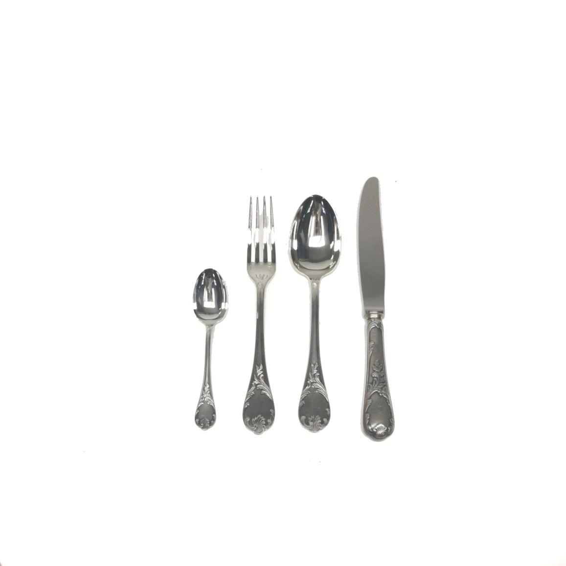 12 cuillères à soupe, 12 fourchettes à dîner, 6 couteaux et 12 petites cuillères
