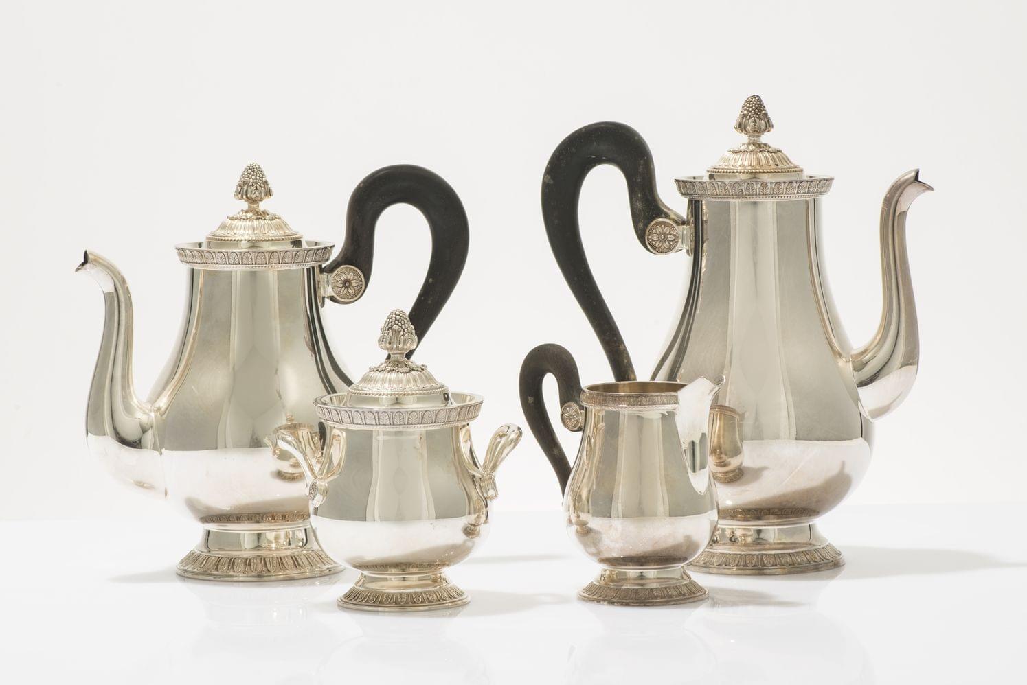 Métal argenté, comprenant: théière, cafetière, sucrier et crémier (4p)