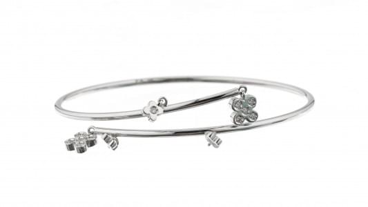 1028. Bracelet jonc ouvert retenant cinq petits charms sertis de diama...