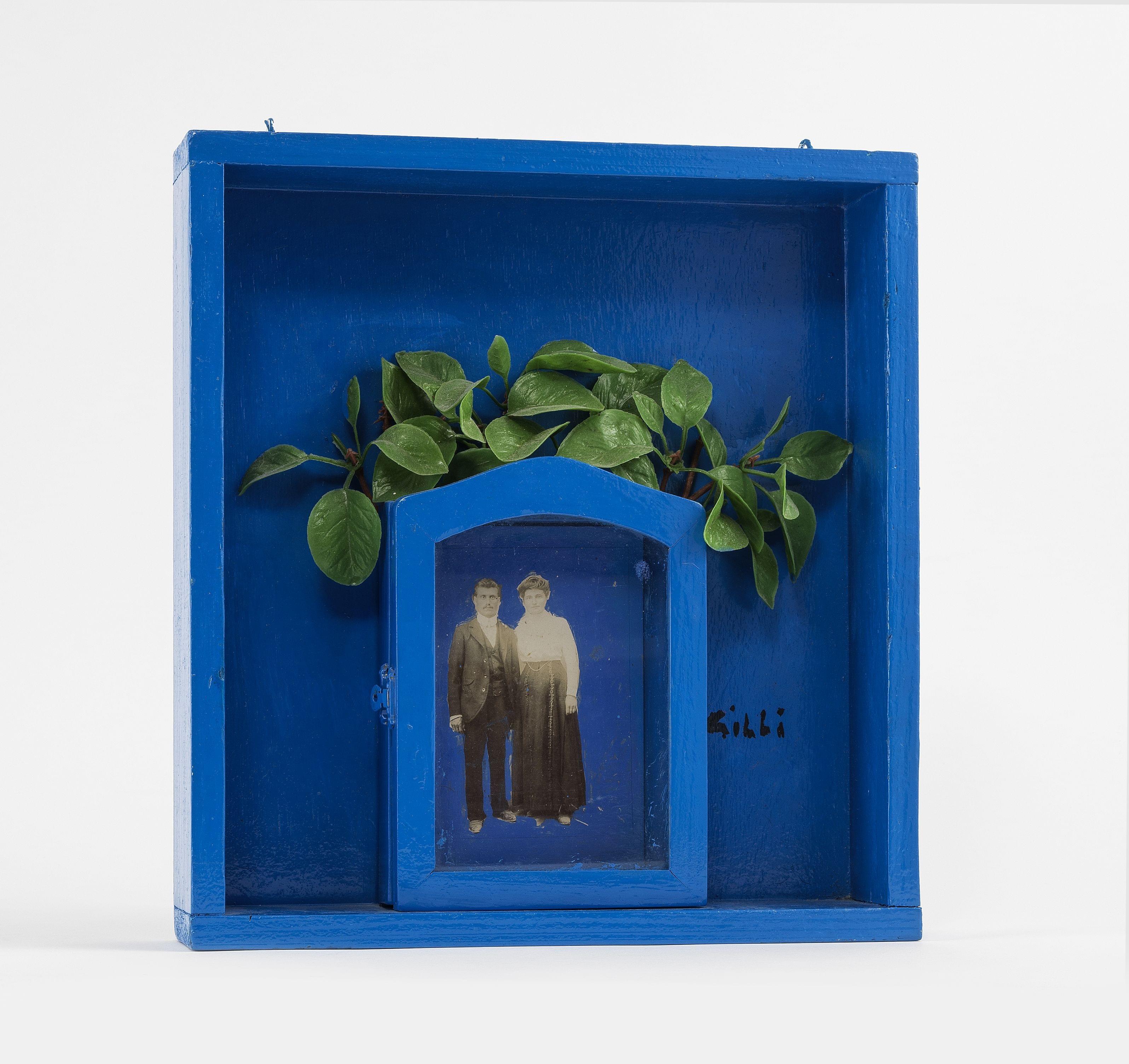 Ex-voto avec photographie figurant un couple, bois peint, plantes artificielles, tirage argentique, 35x32x7 cm