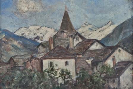 Village valaisan, huile sur carton, cachet de l'atelier au dos,...