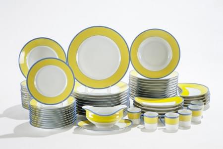 425. Service à dîner à marli jaune bordé d'un filet bleu, modèle dess...