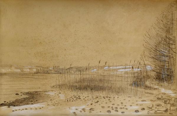 Roseaux au bord du lac, mine de plomb sur papier, signature apoc...
