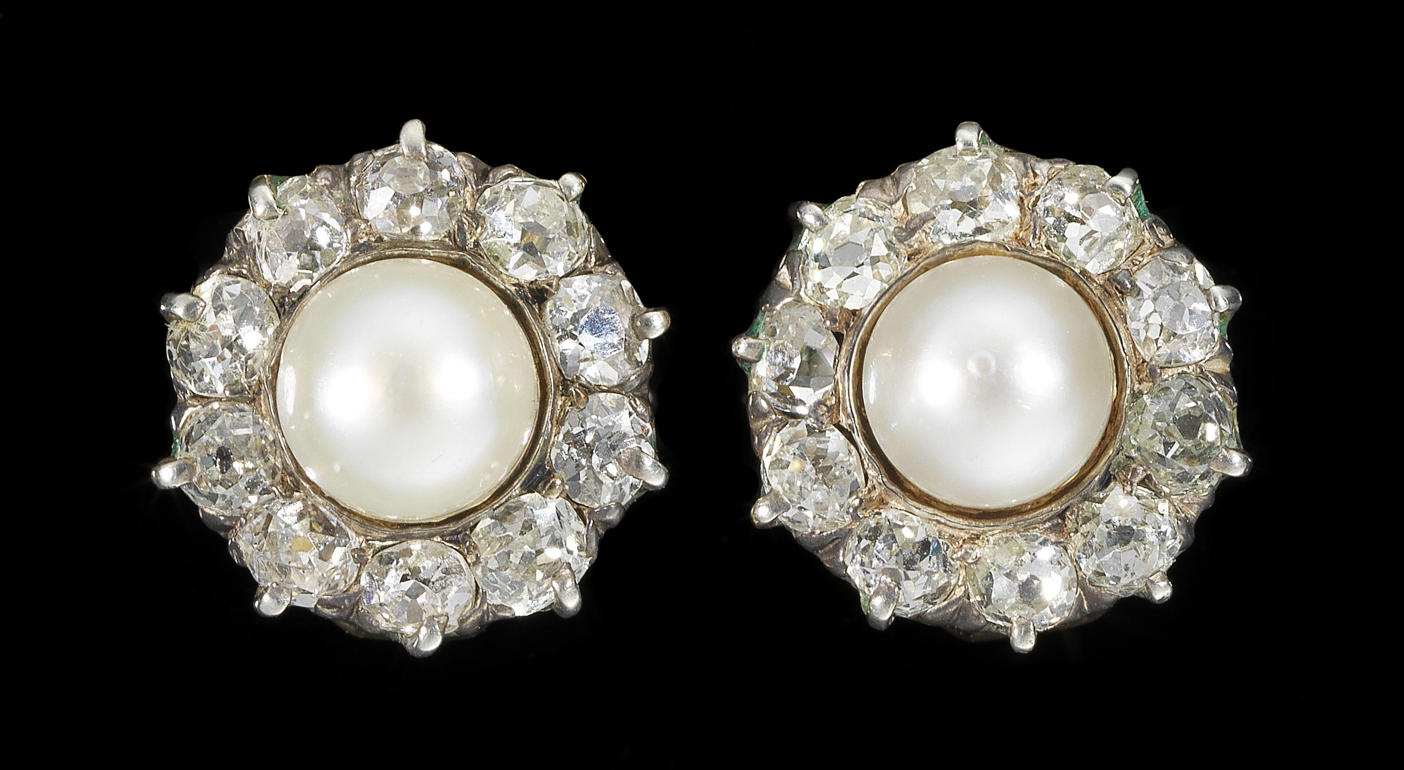 3222. Clips d'oreilles centrés de perles blanches (D env. 5,8 mm) entourées de roses de diamant