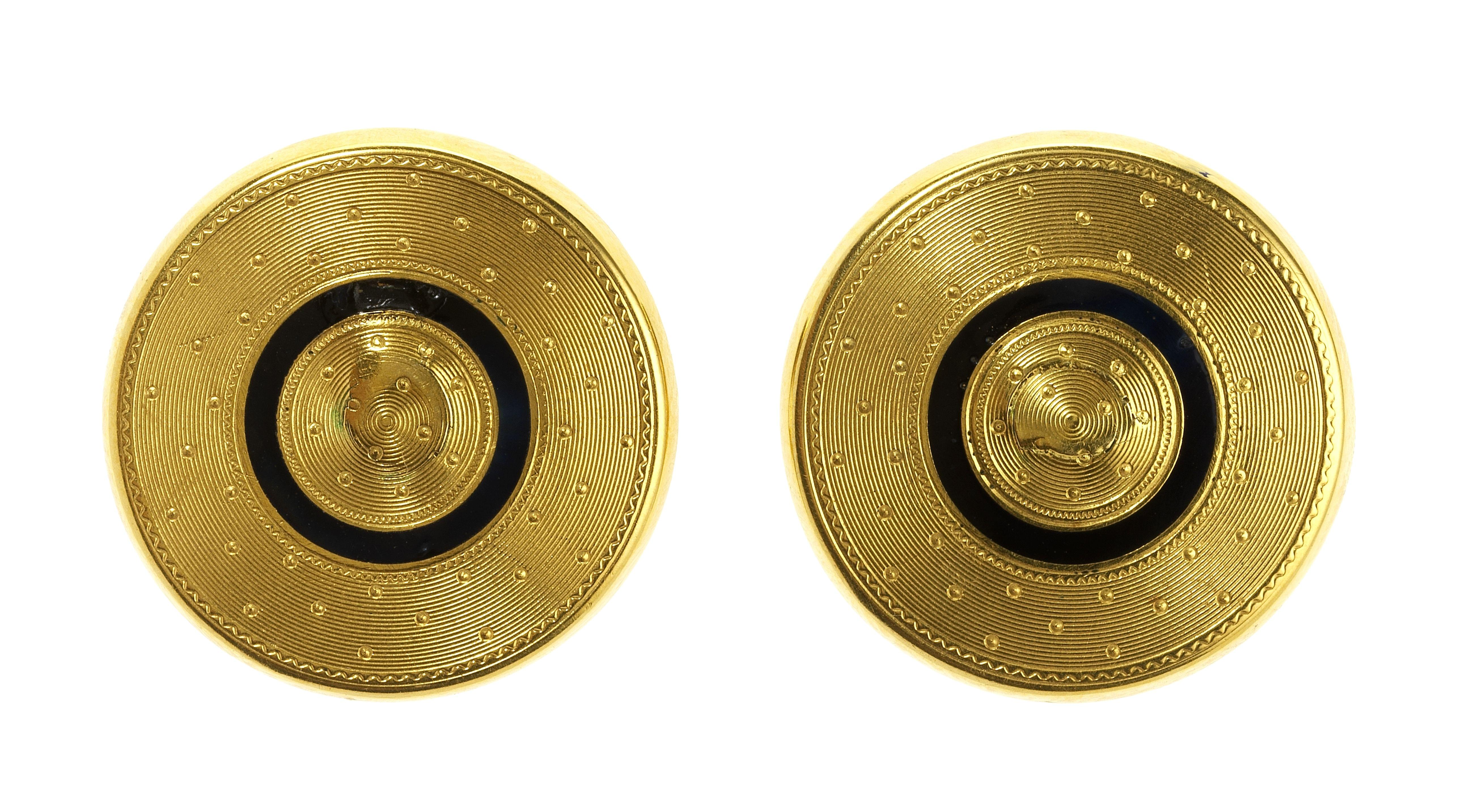 3216. *Clips d'oreilles ronds ciselés cerclés d'émail noir