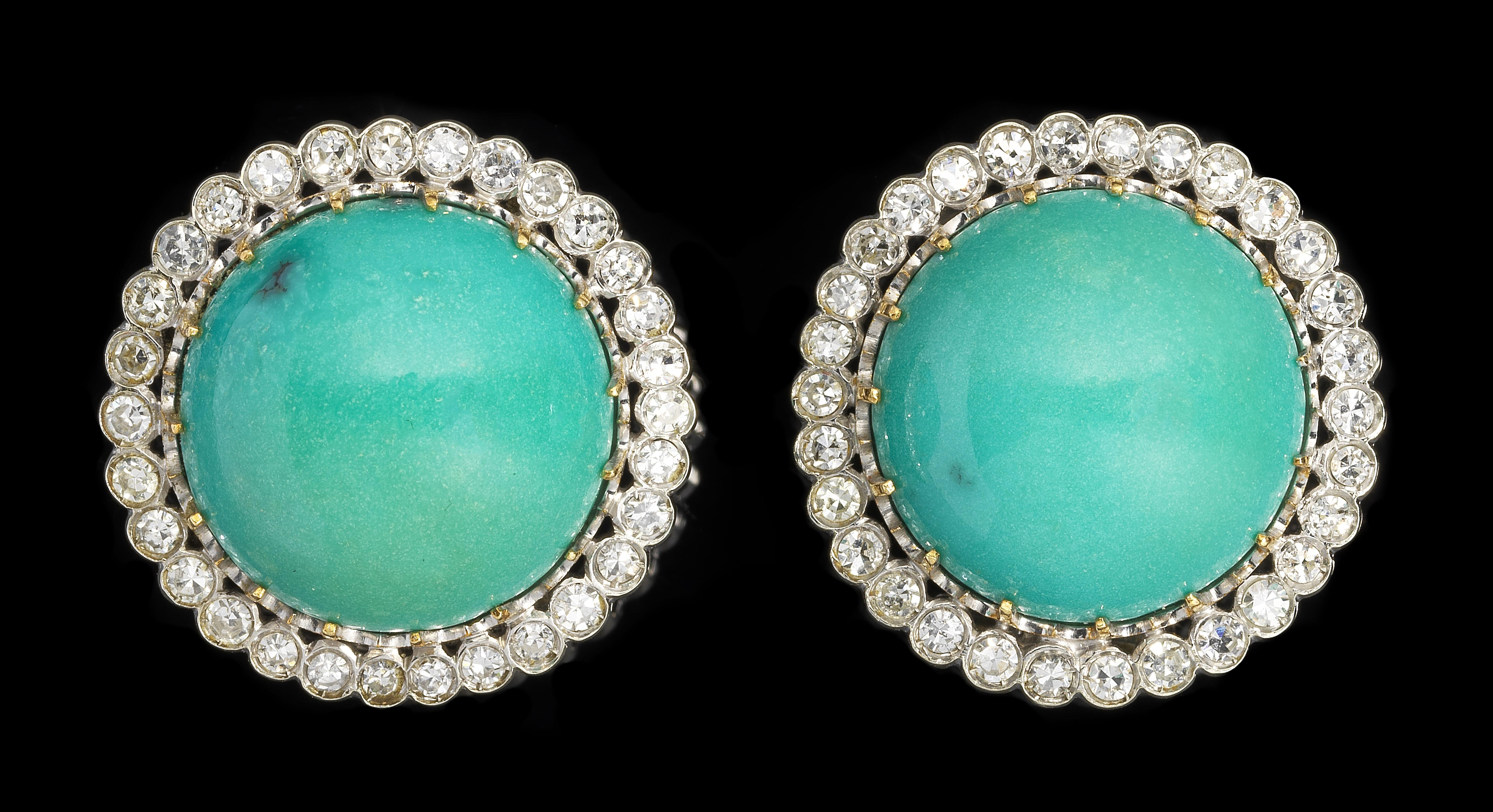 3346. Clips d'oreilles sertis chacun d'une turquoise taille cabochon ronde entourée de diamants taille 8/8