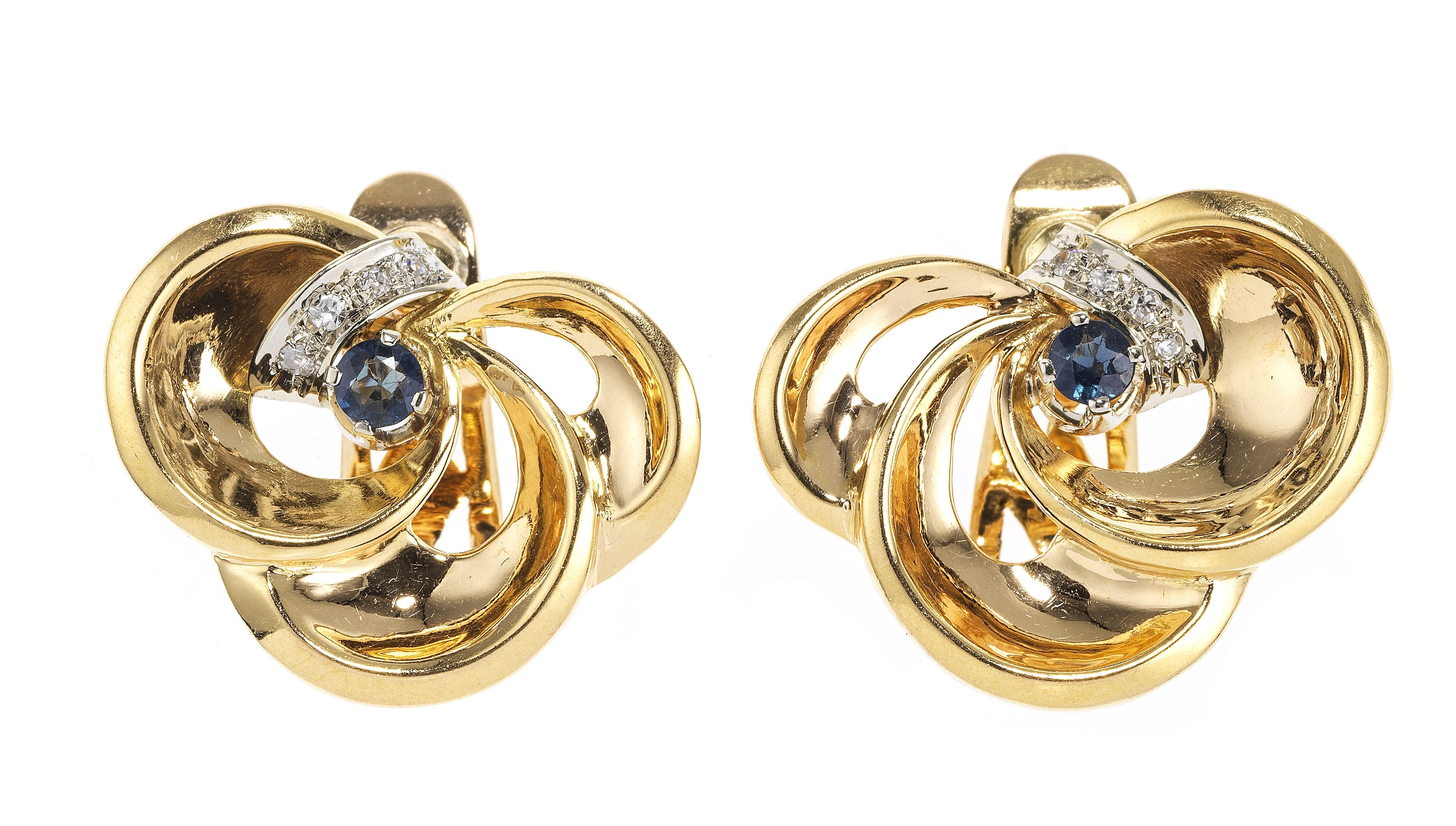 3374. Clips d'oreilles stylisés sertis de saphirs taille brillant rehaussés d'une ligne de saphirs blancs