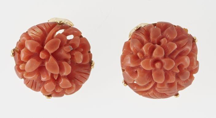 1012. Bague sertie d'un corail épaulé de deux saphirs orange taille cœ...