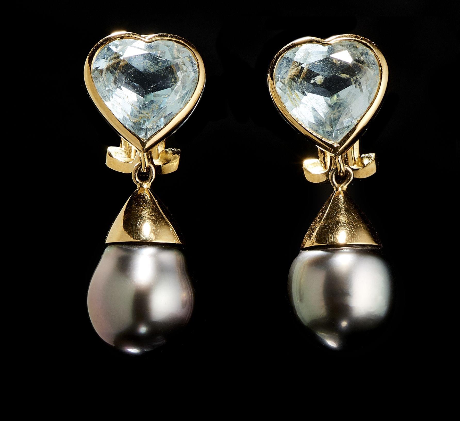 83. Clips d'oreilles sertis de topazes bleues taille cœur retenant des perles de Tahiti