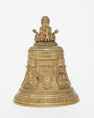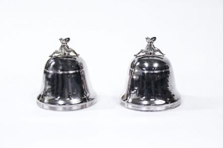 3258. Deux tirelires en forme de cloche sommée d'un couple assis dos à...