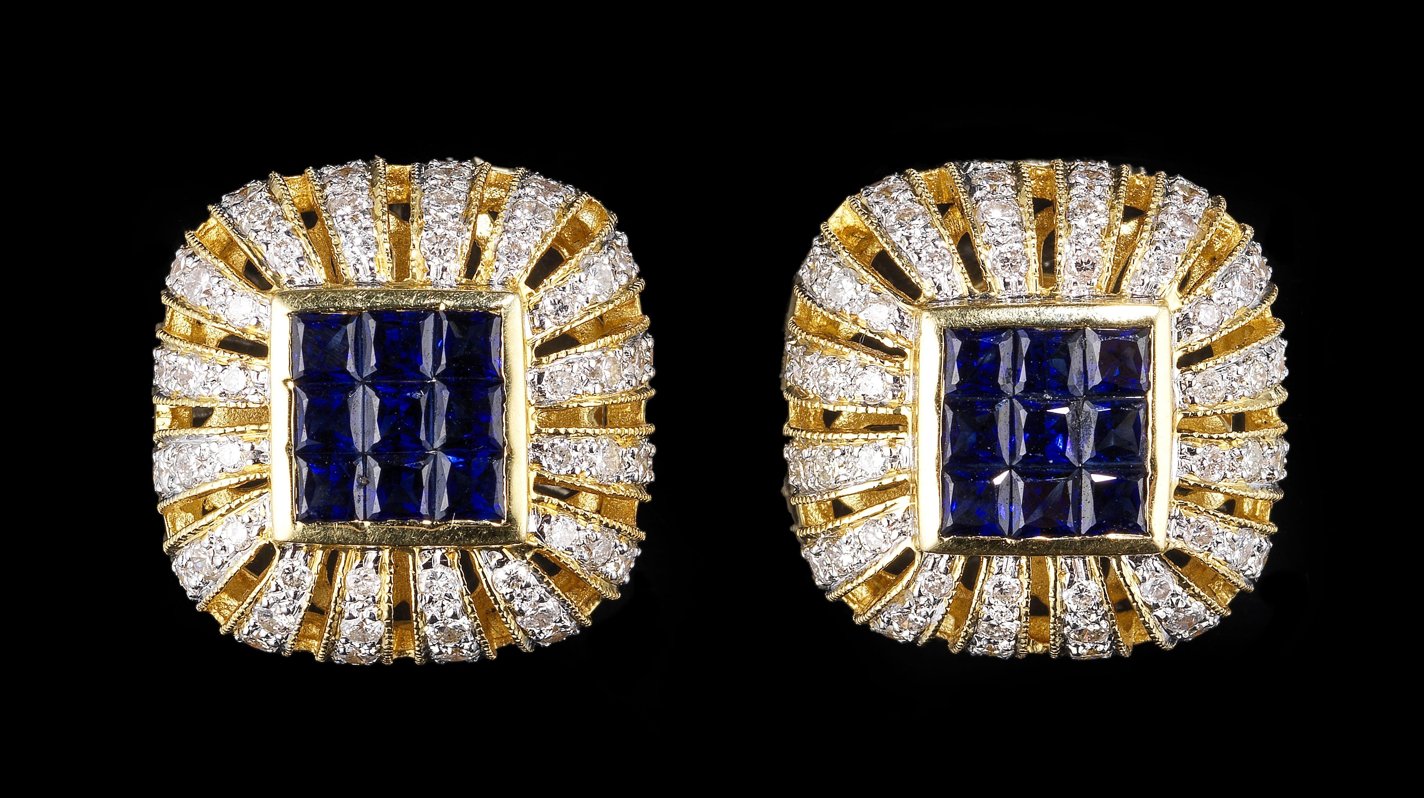 3453. *Clous d'oreilles centrés d'un motif carré pavé de saphirs calibrés en serti invisible