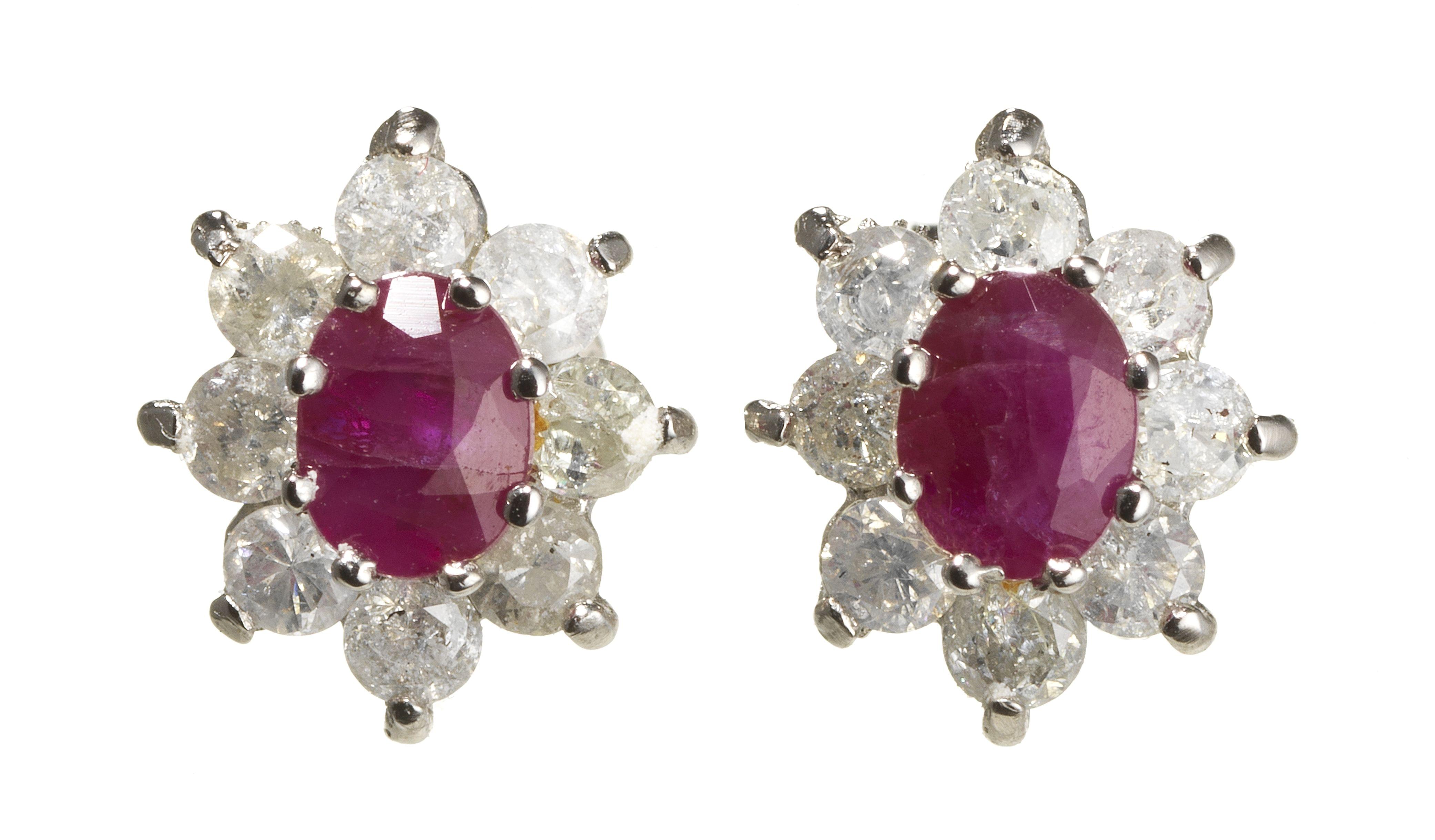 3294. *Clous d'oreilles fleurs centrées de rubis taille ovale entourés de diamants