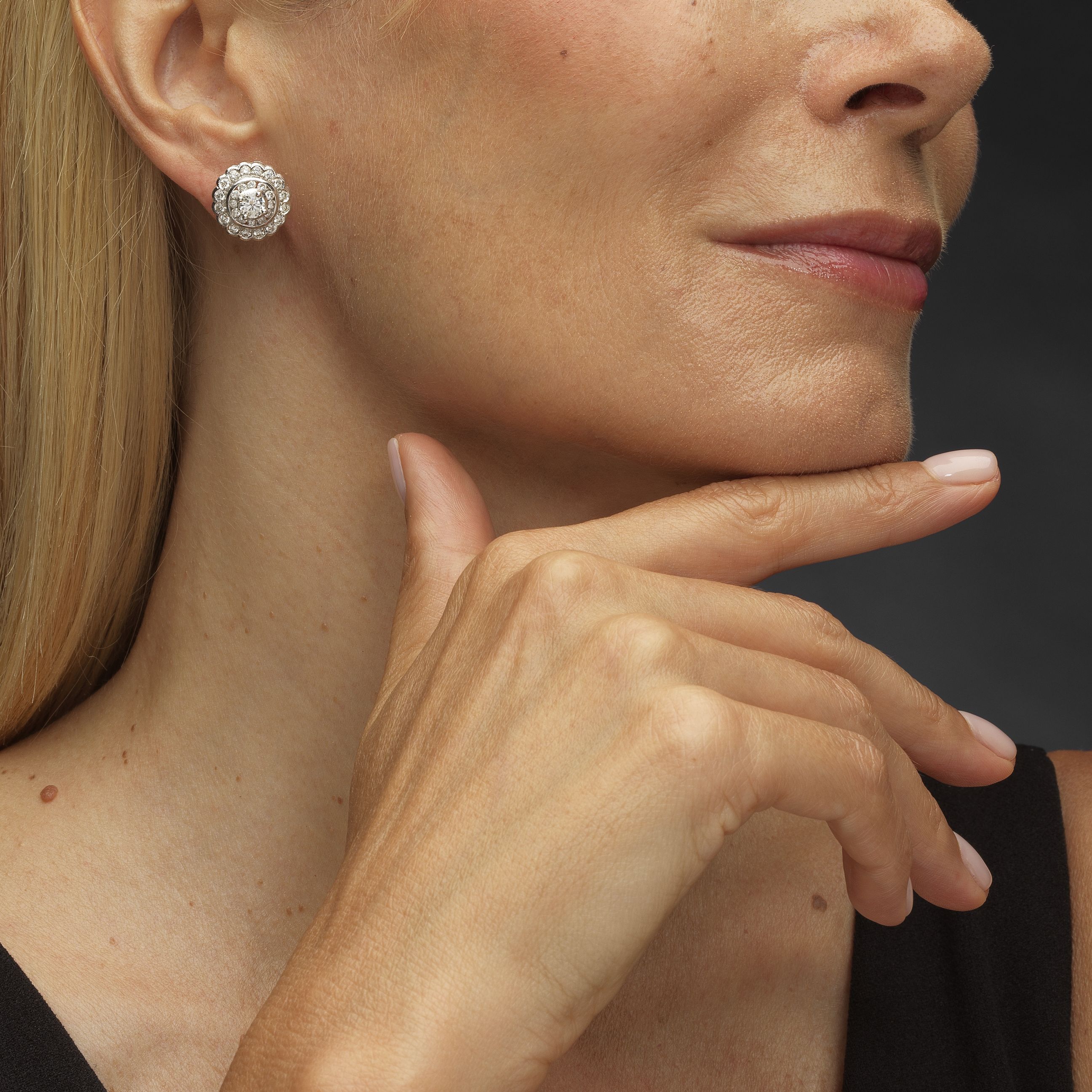 Dans un double entourage de diamants (total env. 1.5 ct), or gris 750, D 1,5 cm, 7 g. Pour les lots précédés d'un *, la TVA de 8,1% est due sur l'entier du prix d'adjudication.