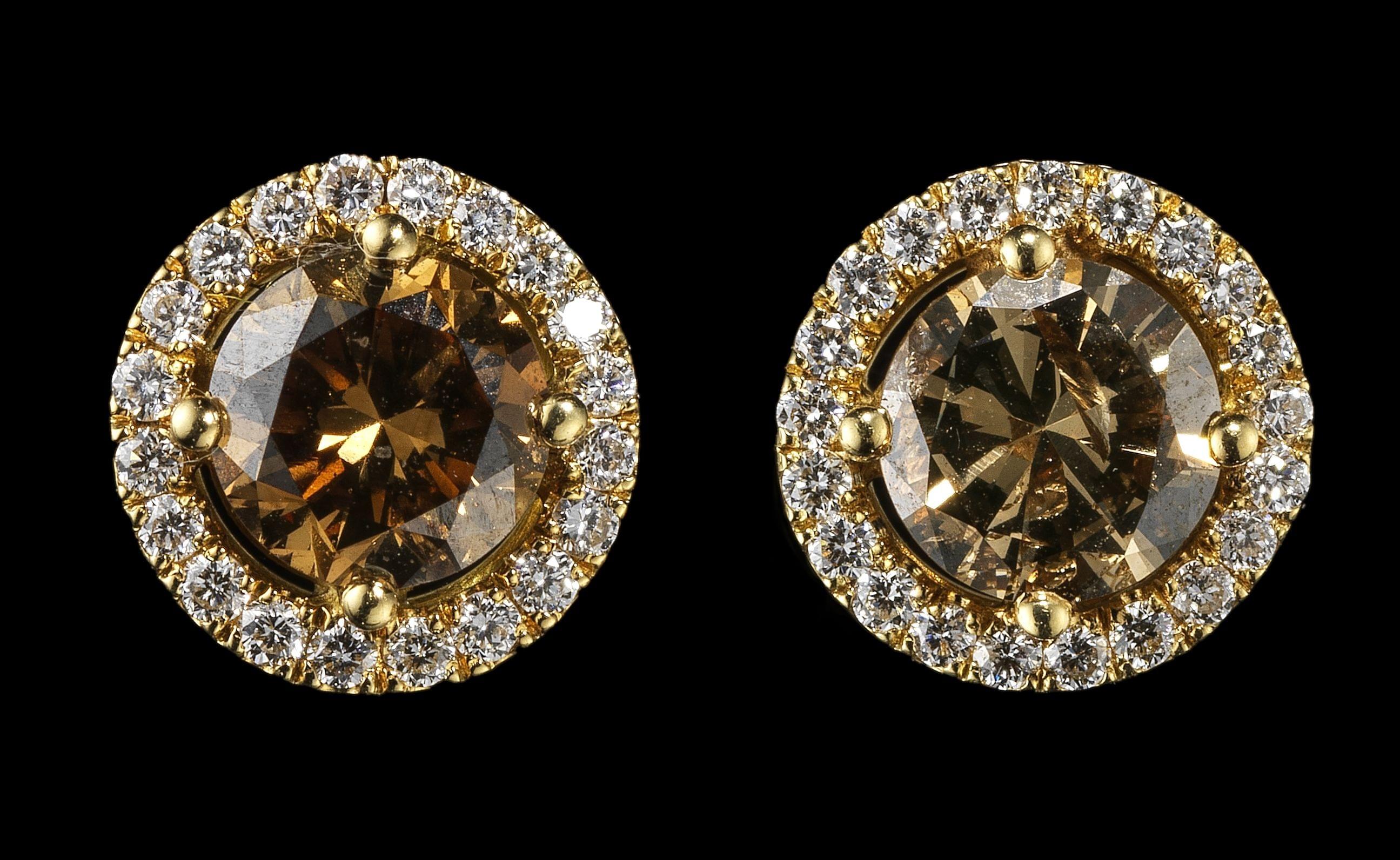 298. Clous d'oreilles sertis de diamants cognac (env. 1 ct) entourés de diamants
