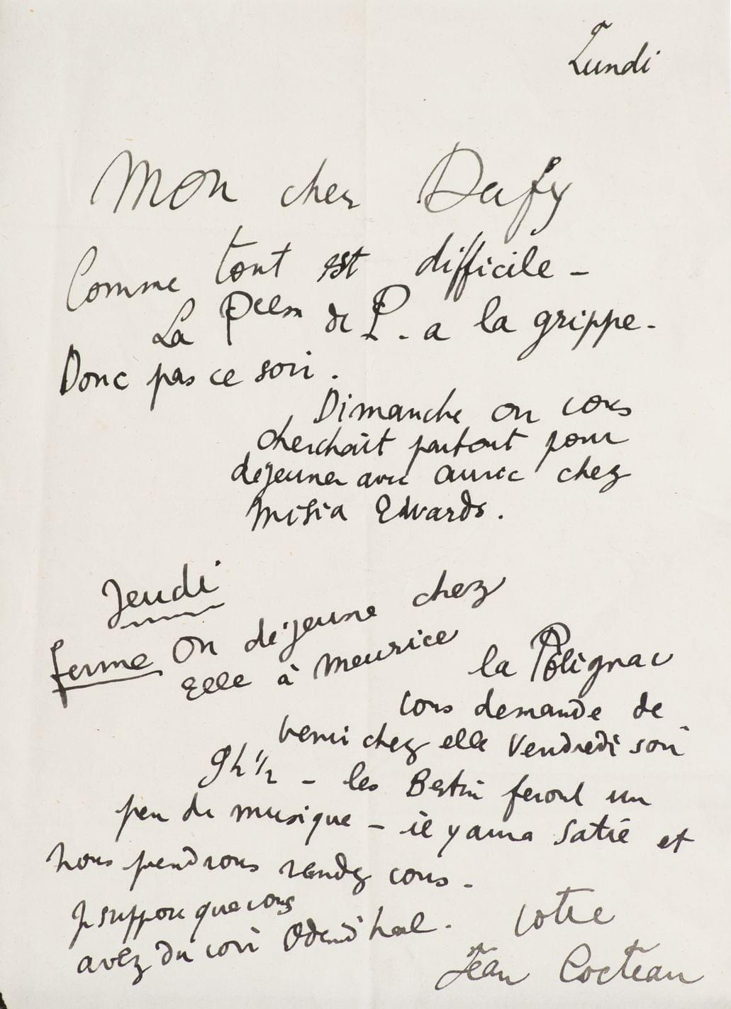 1 page in-4°, adressée au peintre (Jean) Duffy, dans laquelle il cite plusieurs personnes de leurs amis: "…La Princesse de P. a la grippe. Donc pas ce soir. Dimanche on vous cherchait partout pour déjeuner avec Auric chez Misia Edwards…"