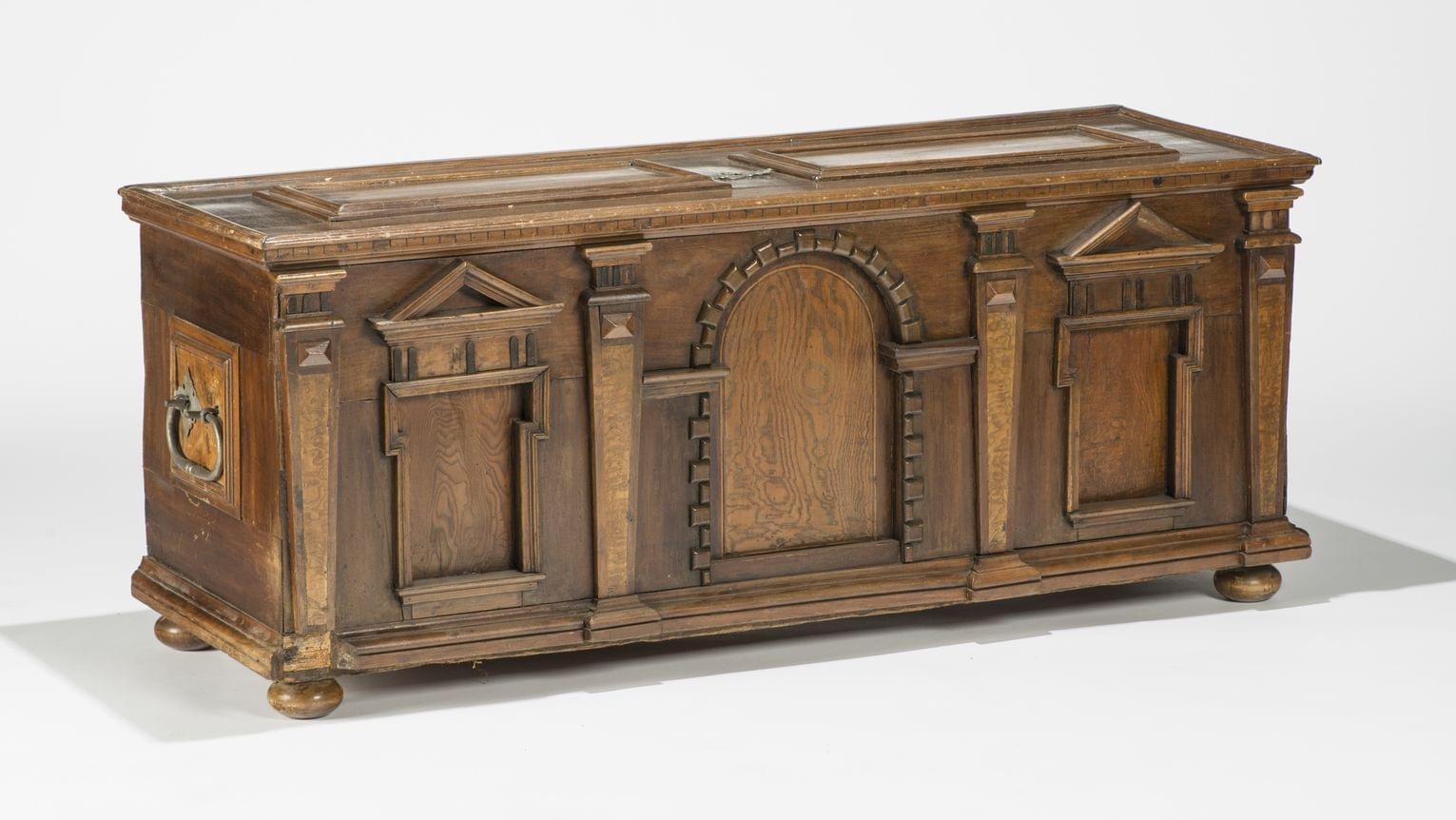 Bois fruitier et noyer, façade architecturée, plateau abattant, poignées latérales en fer forgé, Suisse, XVIIe s, 66x163x57 cm
