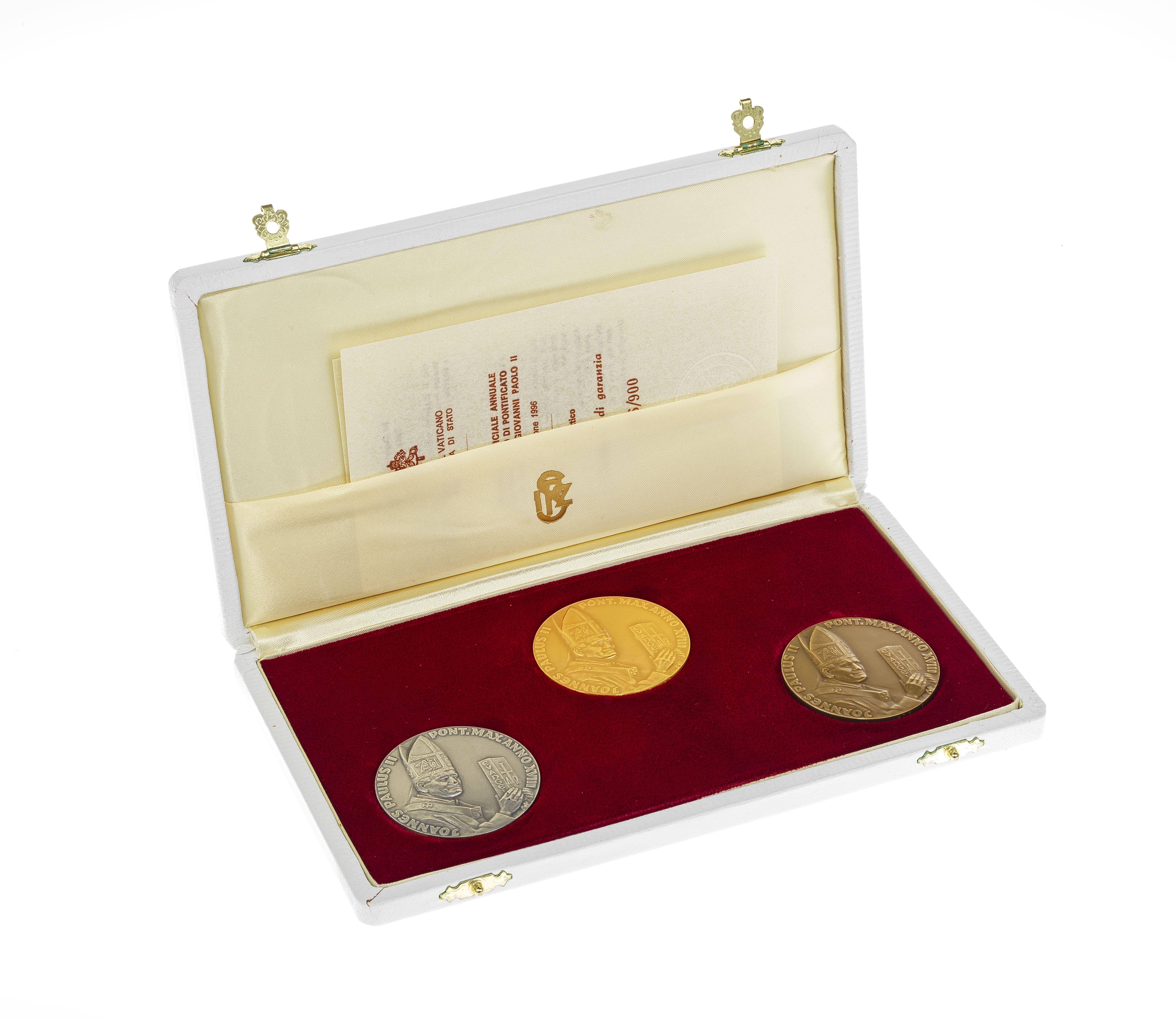 3558. Coffret de trois médailles annuelles officielles du Vatican à l'effigie du pape Jean-Paul II datés 1996