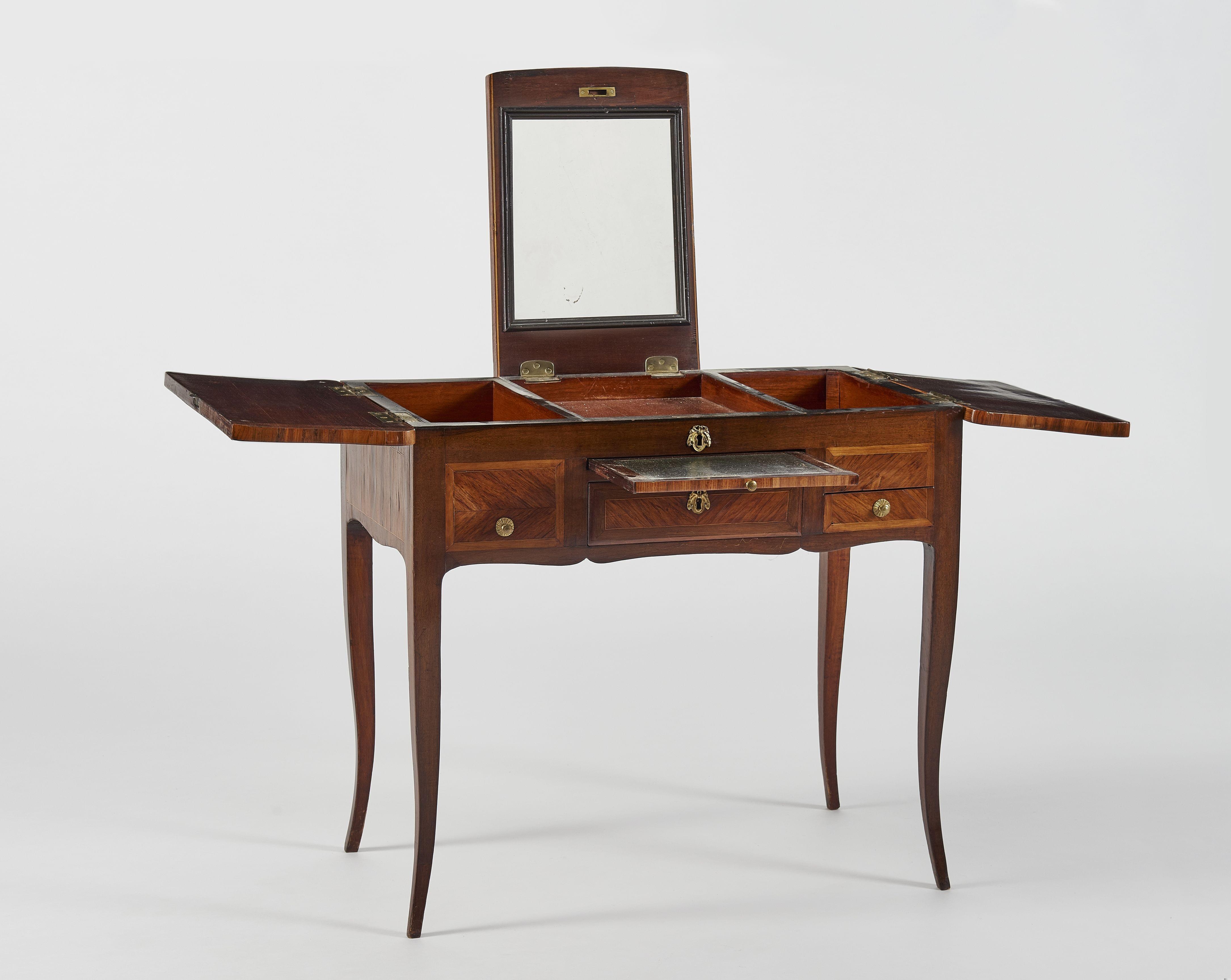 Une tablette, deux tiroirs et plateau à abattants, bois de rose et bois de violette, 79x79x45 cm